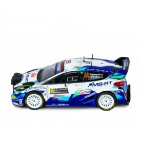 Miniature diecast à l'échelle 1/43 de la Ford Fiesta RS WRC de Gus Greensmith. Voiture fournie avec la rampe de phares longue portée montée.