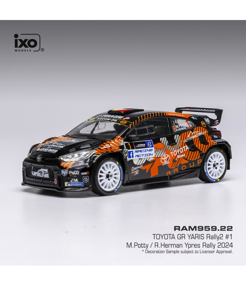 Miniature à l'échelle 1/43 de la Toyota Yaris Rally2 avec laquelle Maxime Potty et Renaud Herman ont participé au Ypres Rally 2024.